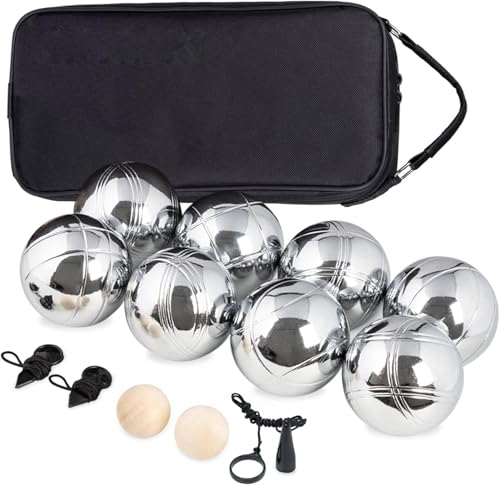 Das Truevaste Boule Set ist ein umfassendes Spielset, das alle notwendigen Einzelteile enthält. Es besteht aus 8 hochwertigen Boccia Kugeln aus Metall, 2 Zielkugeln, 2 Maßbändern und einer Magnetvorrichtung für die Boules-Kugel sowie einer Tragetasche.